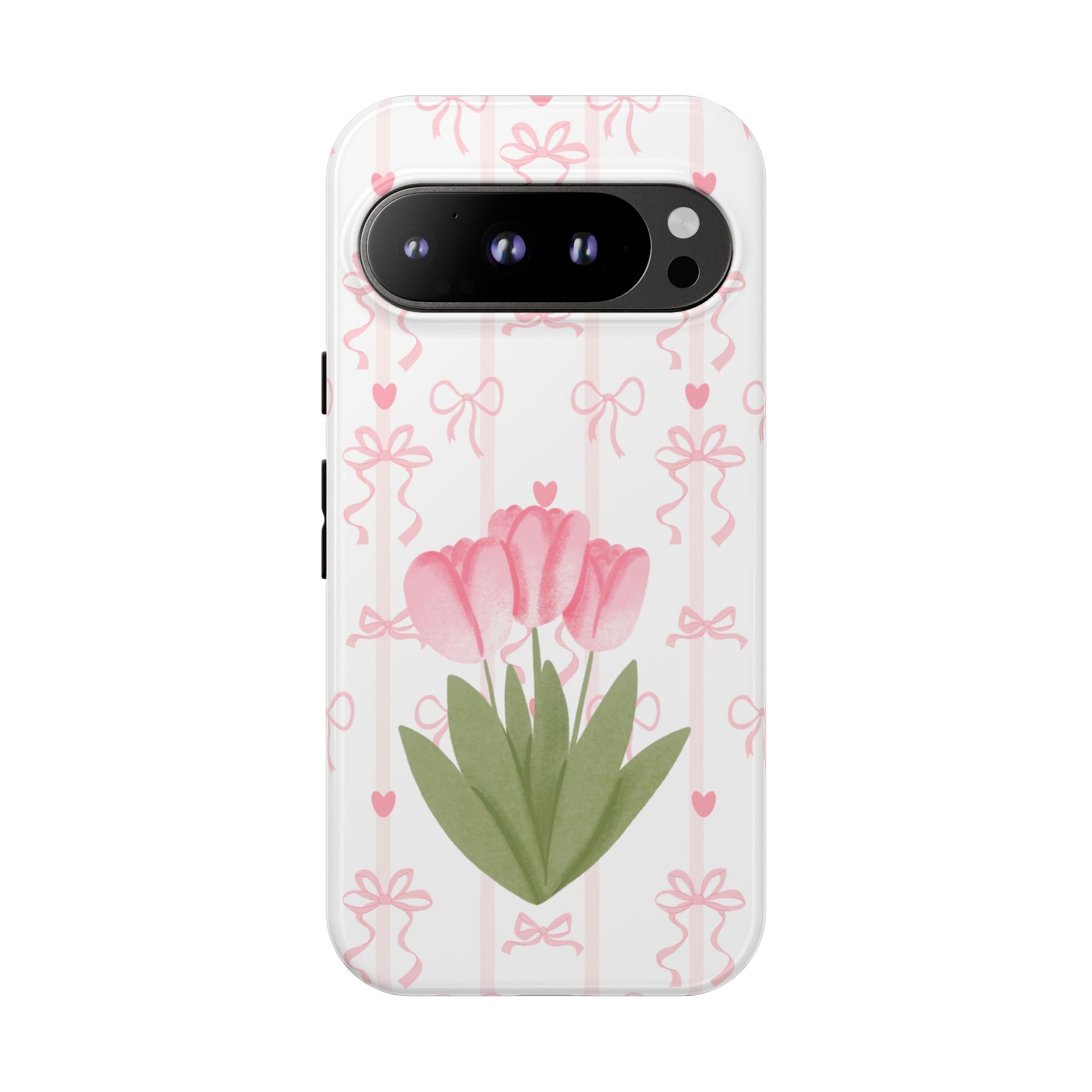 Sweetness and romance in a delicate design. A soft pink stripe and ribbon pattern forms the backdrop for three perfect pink tulips. It’s a charming, feminine look, perfect for those who love all things soft and lovely.