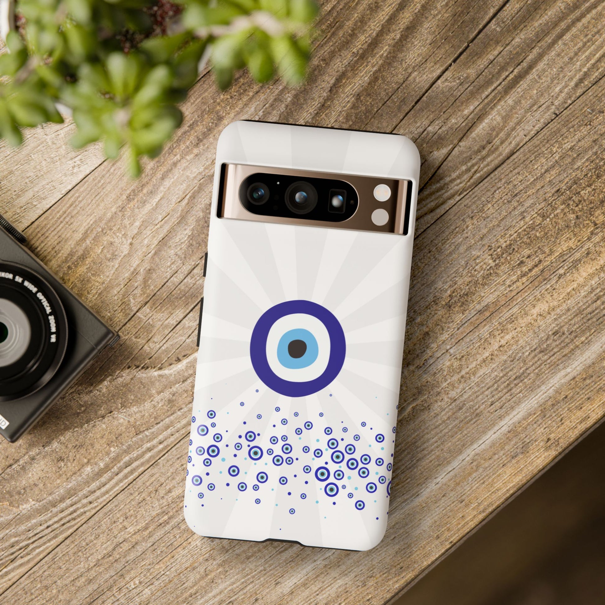 This eye-catching phone case is a modern take on a protective symbol. A large evil eye takes center stage with rays of light emanating from it, all set against a clean white background. It's a sleek and bold design that stands out.