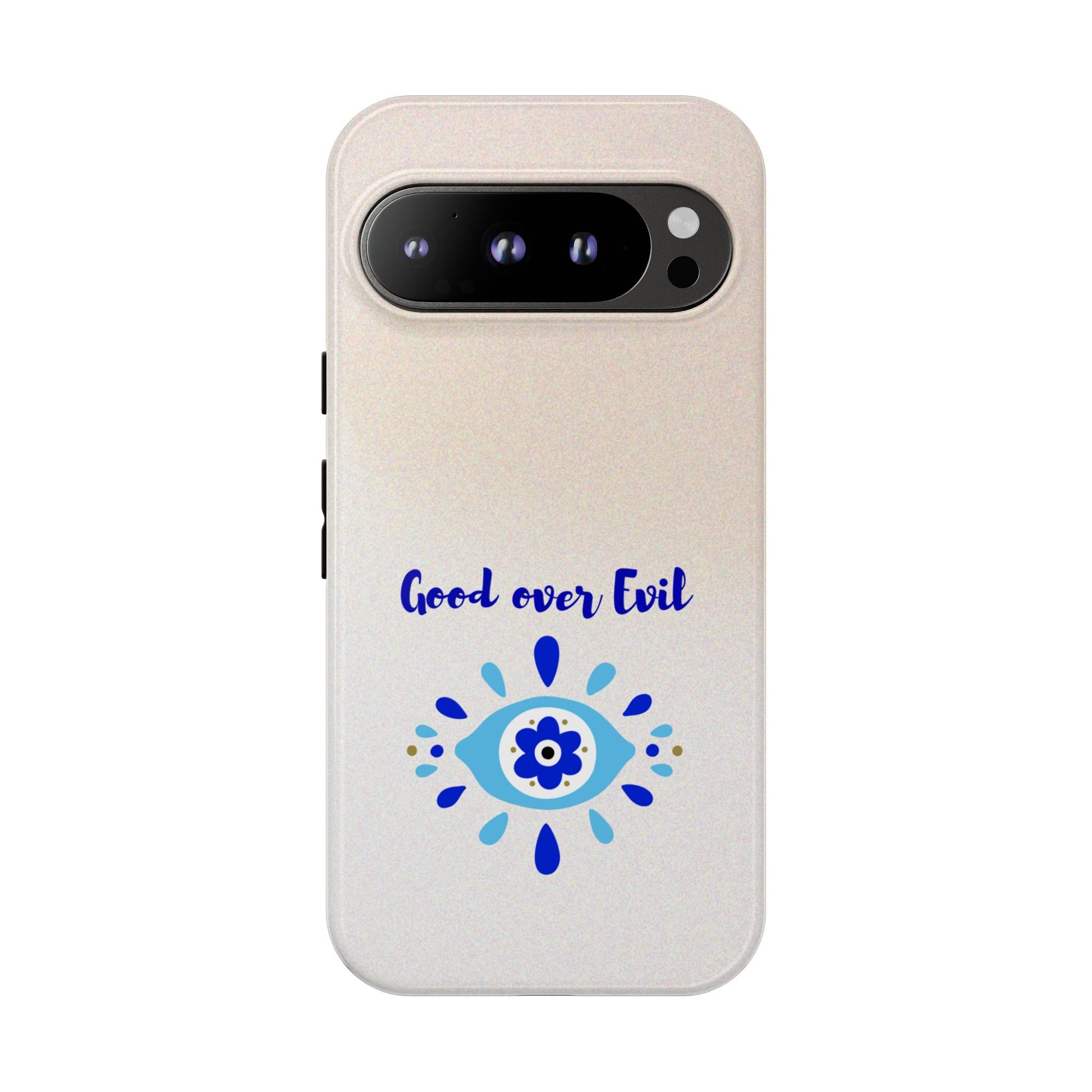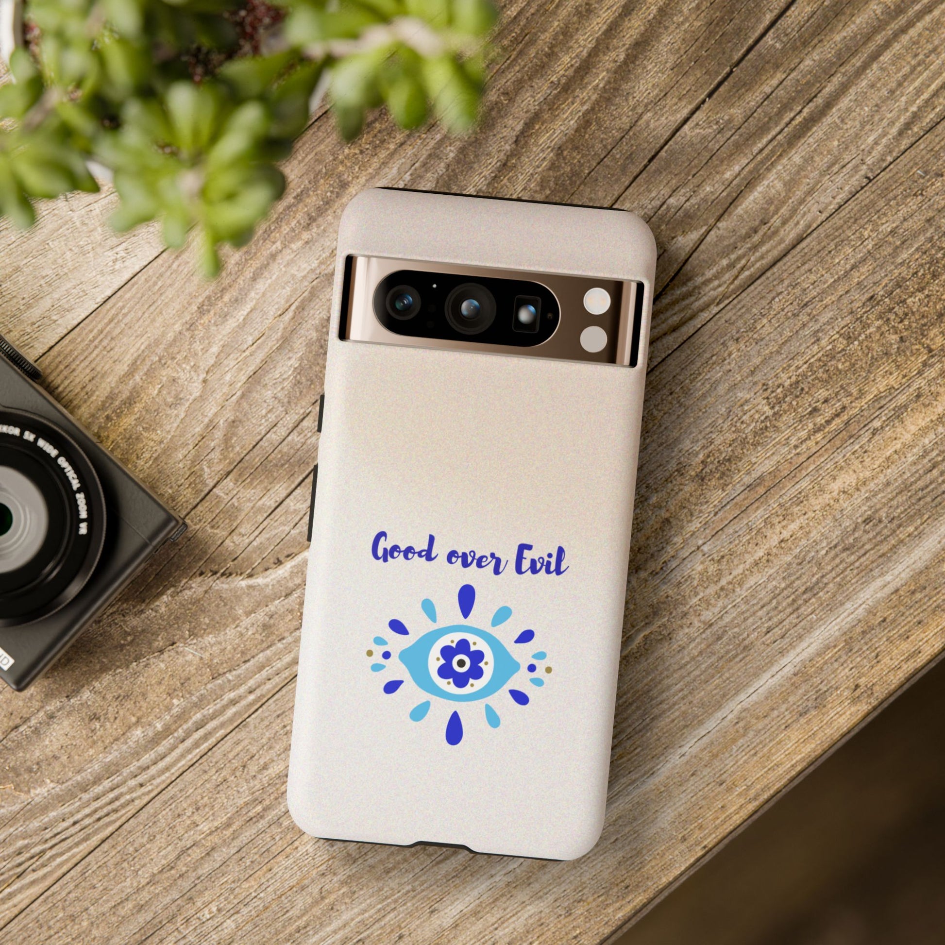 This clean and simple phone case sends a powerful message. It features a beautifully designed evil eye with the words "Good over Evil" above it, symbolizing protection and strength. It's a minimalist and meaningful accessory for daily wear.