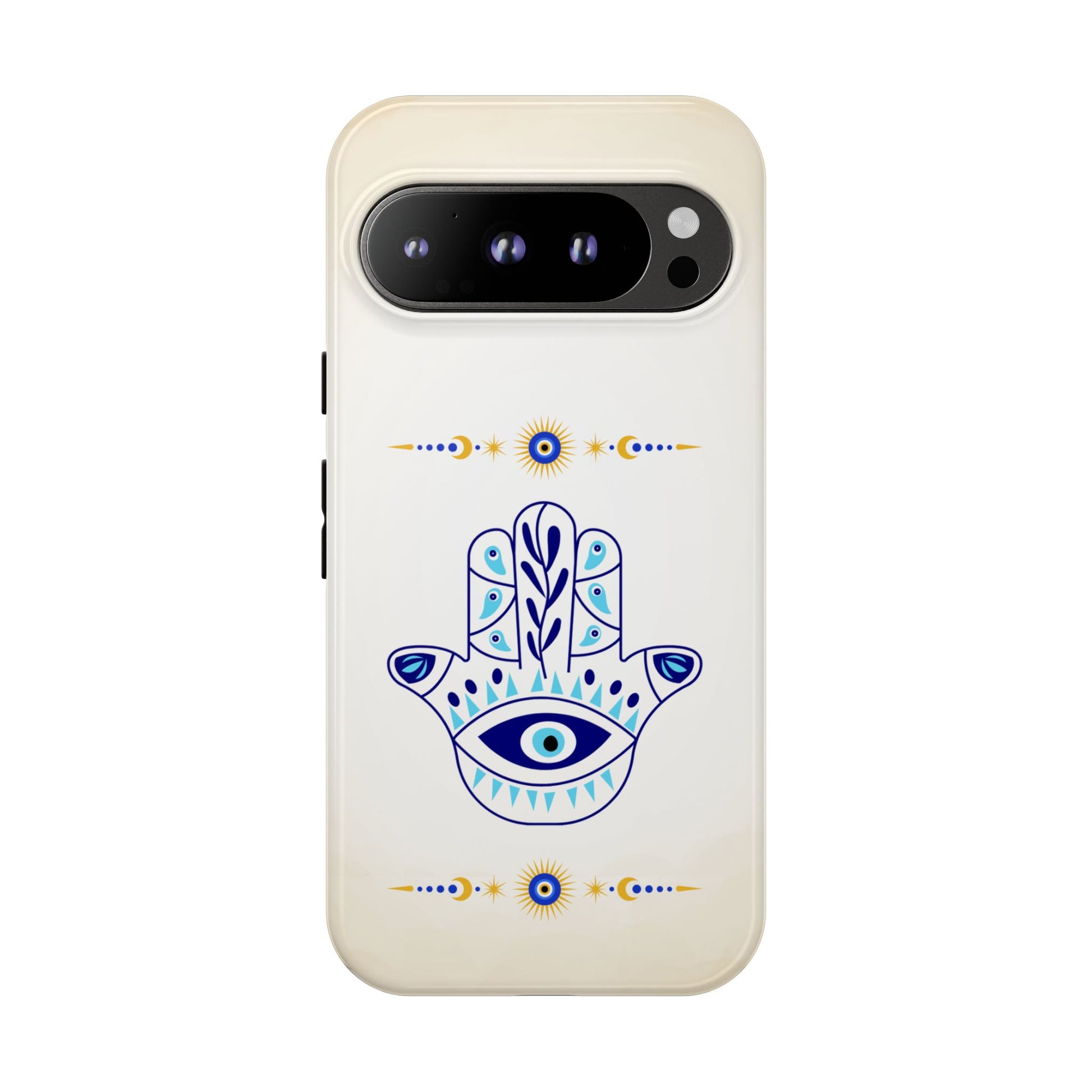 Embrace ancient symbolism with this beautiful Hamsa hand phone case. The intricate design features an evil eye at its center, surrounded by decorative elements and celestial motifs like suns and moons. This case is a perfect blend of spiritual protection and artistic flair, ideal for those who appreciate meaningful and eye-catching accessories.