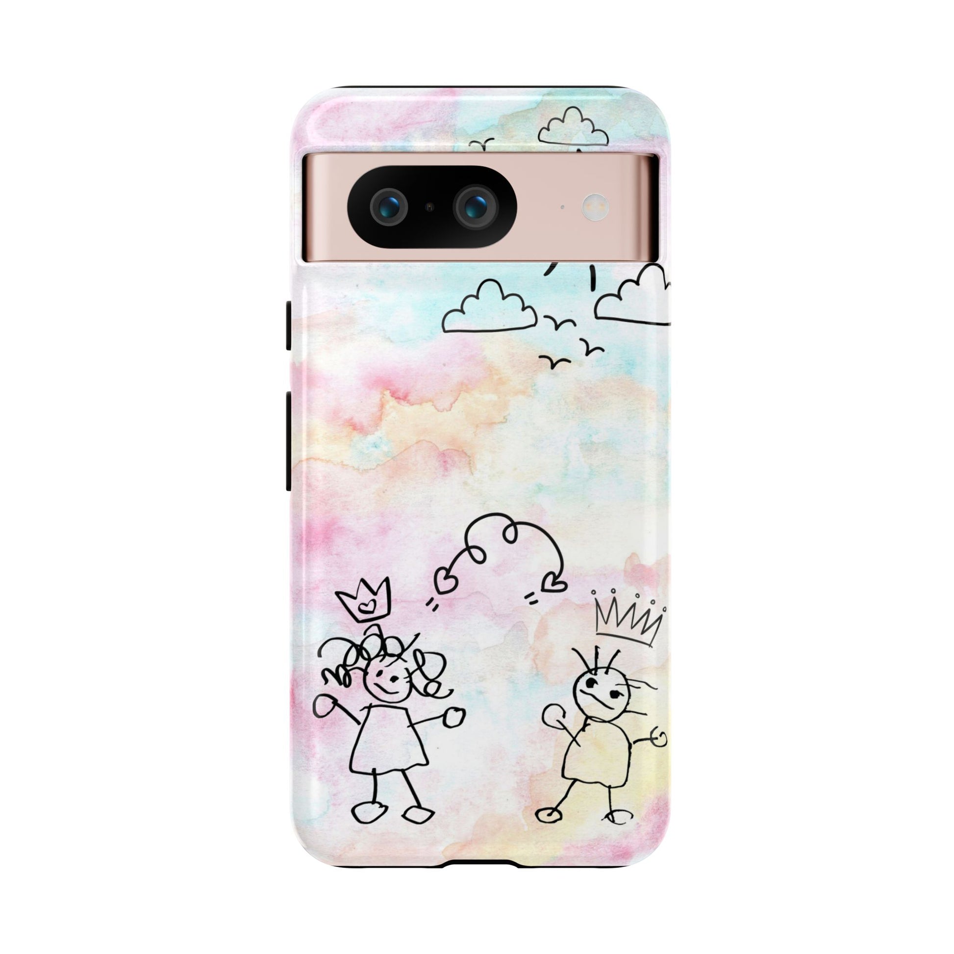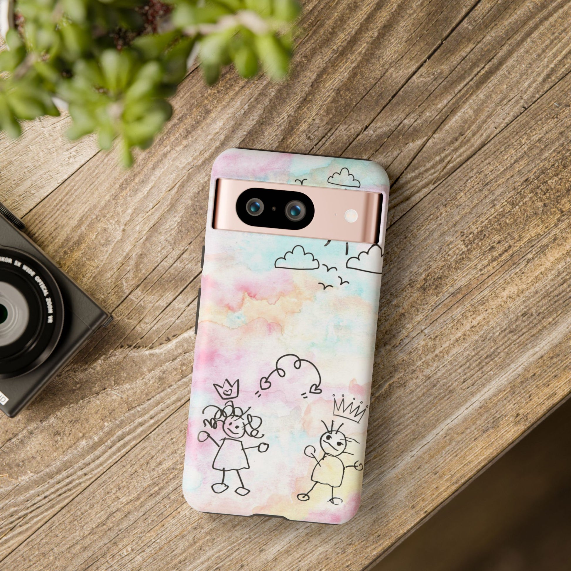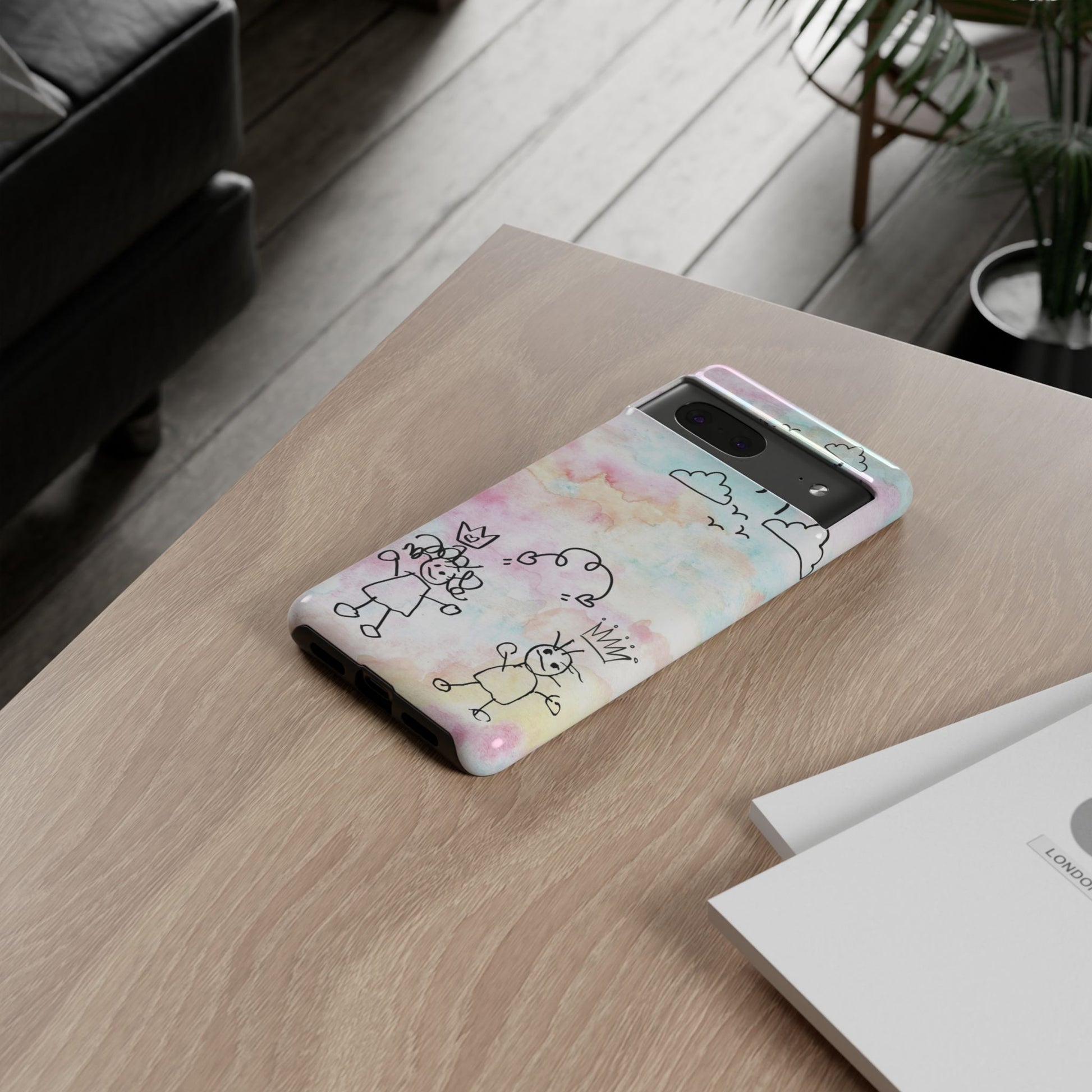 This case is a tribute to the pure, uninhibited joy of a child's first drawing. Featuring wobbly lines, big smiles, and boundless imagination on a soft, watercolor canvas, 'First Masterpiece' is more than a design—it’s a tiny time capsule of love and the most precious art you'll ever own. Carry a piece of that priceless memory with you, always.