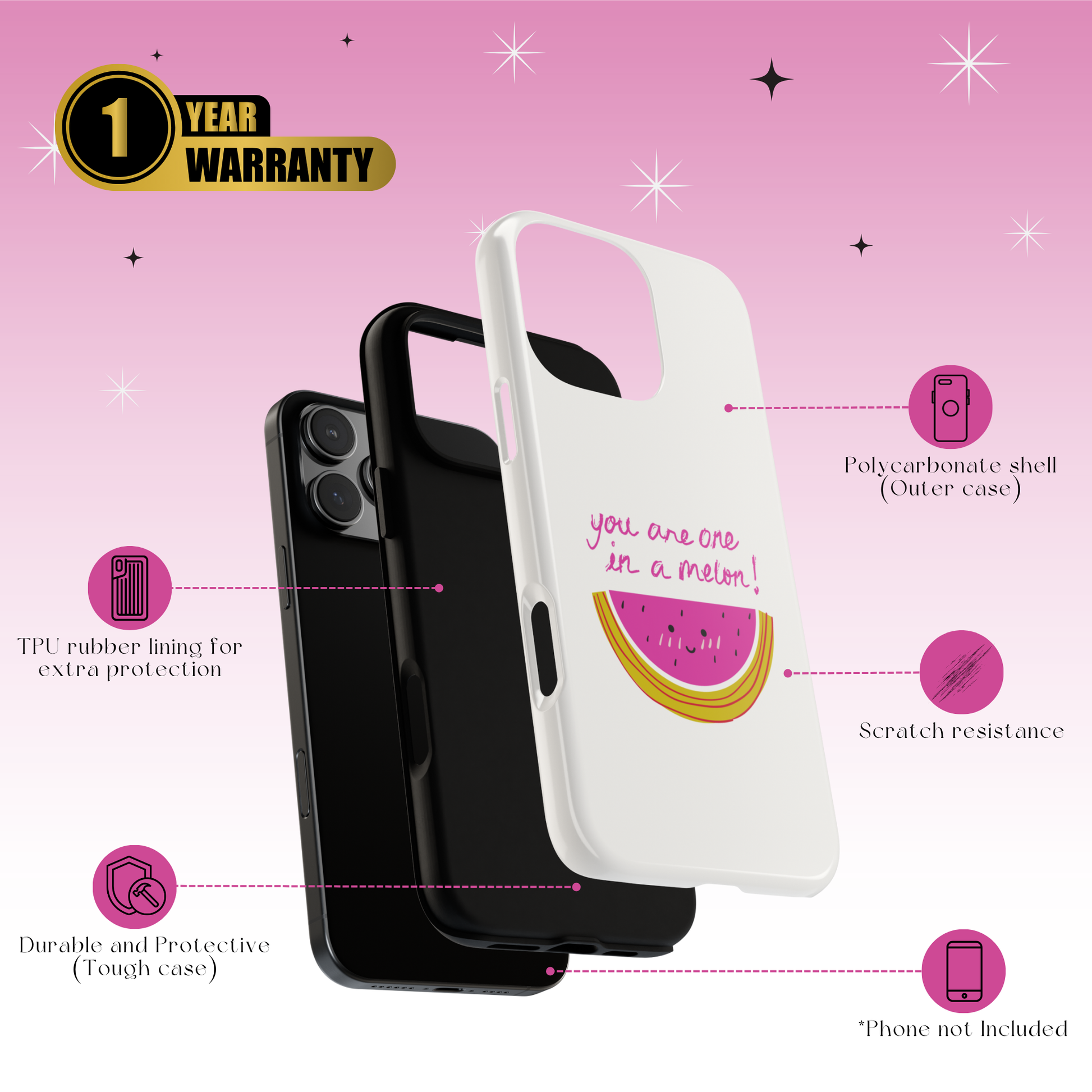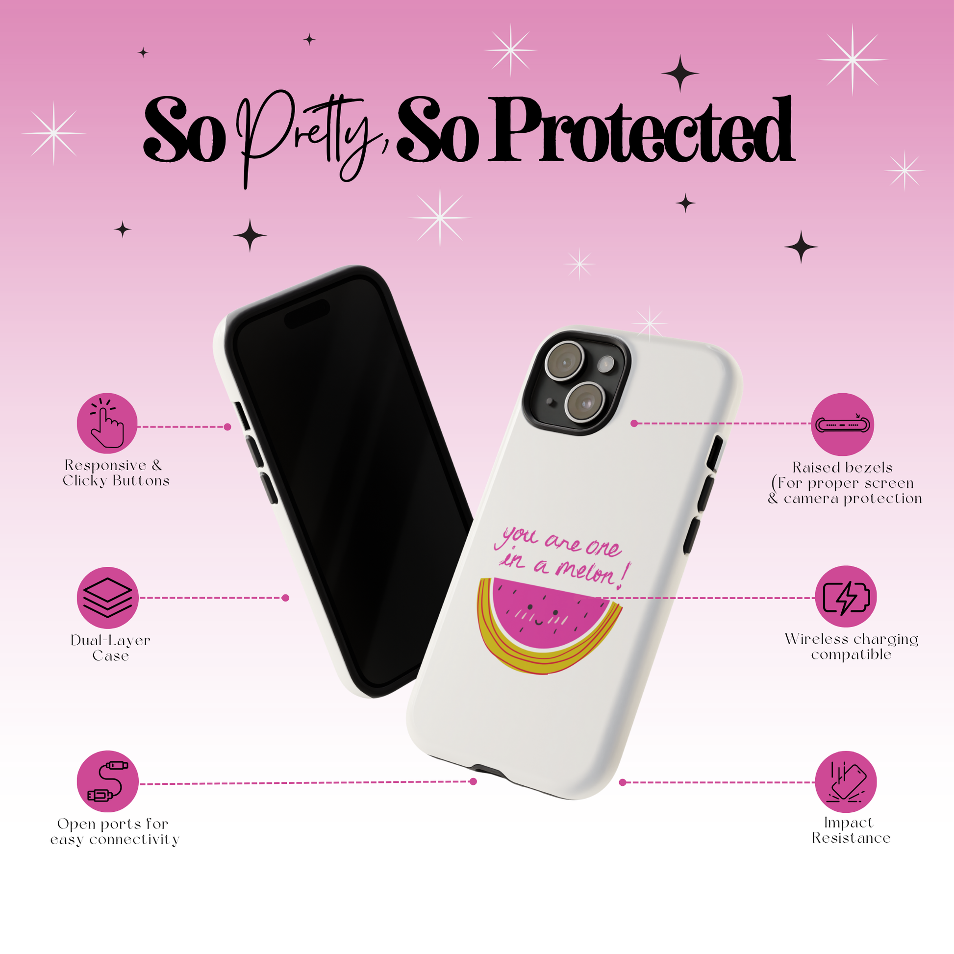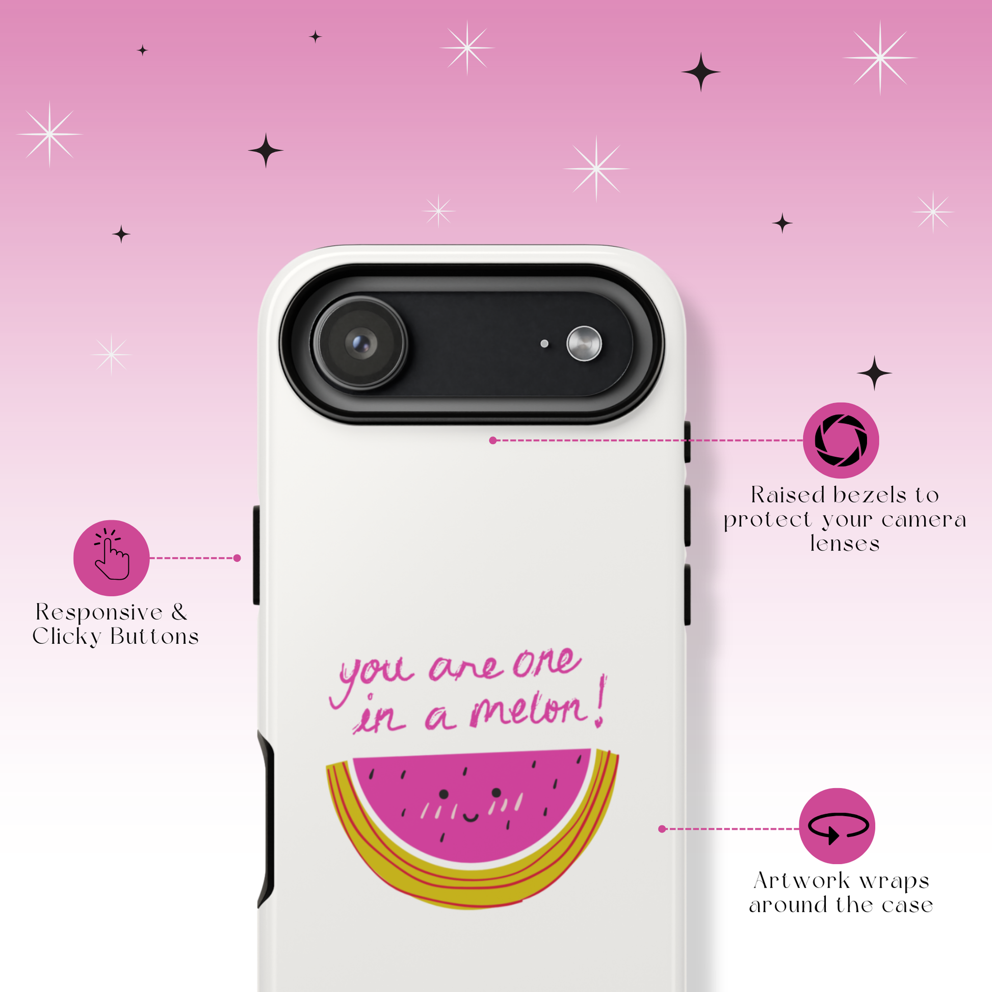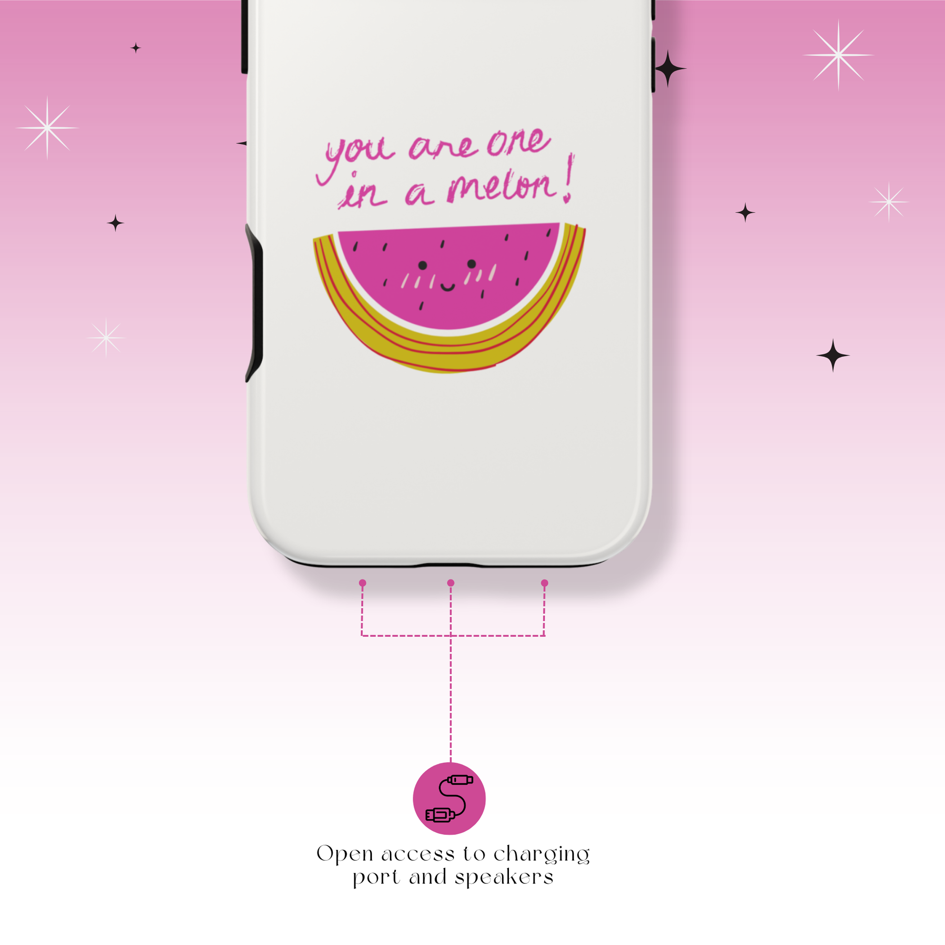 The Melon-Choly case was created for anyone who needs a smile. It's a fun and lighthearted way to brighten your day and the days of those around you. Let the happy watermelon be your personal burst of sunshine, reminding you to find joy in the little things and to always be "one in a melon."