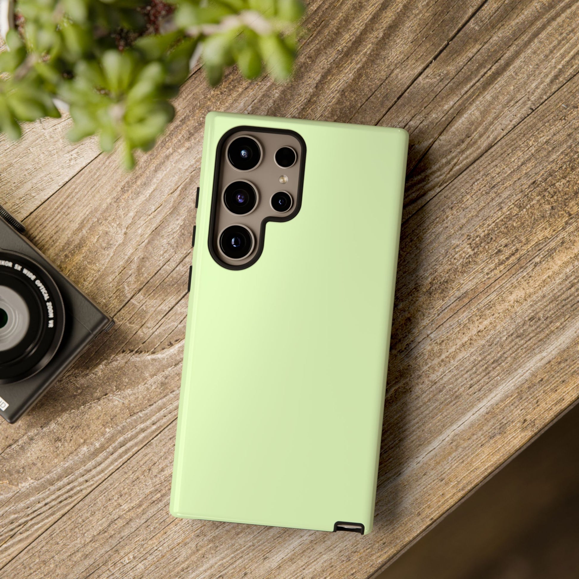 The sophisticated and subtle green of a classic nut. This pale solid color represents an understated elegance and a quiet sense of calm, like a vintage treasure.