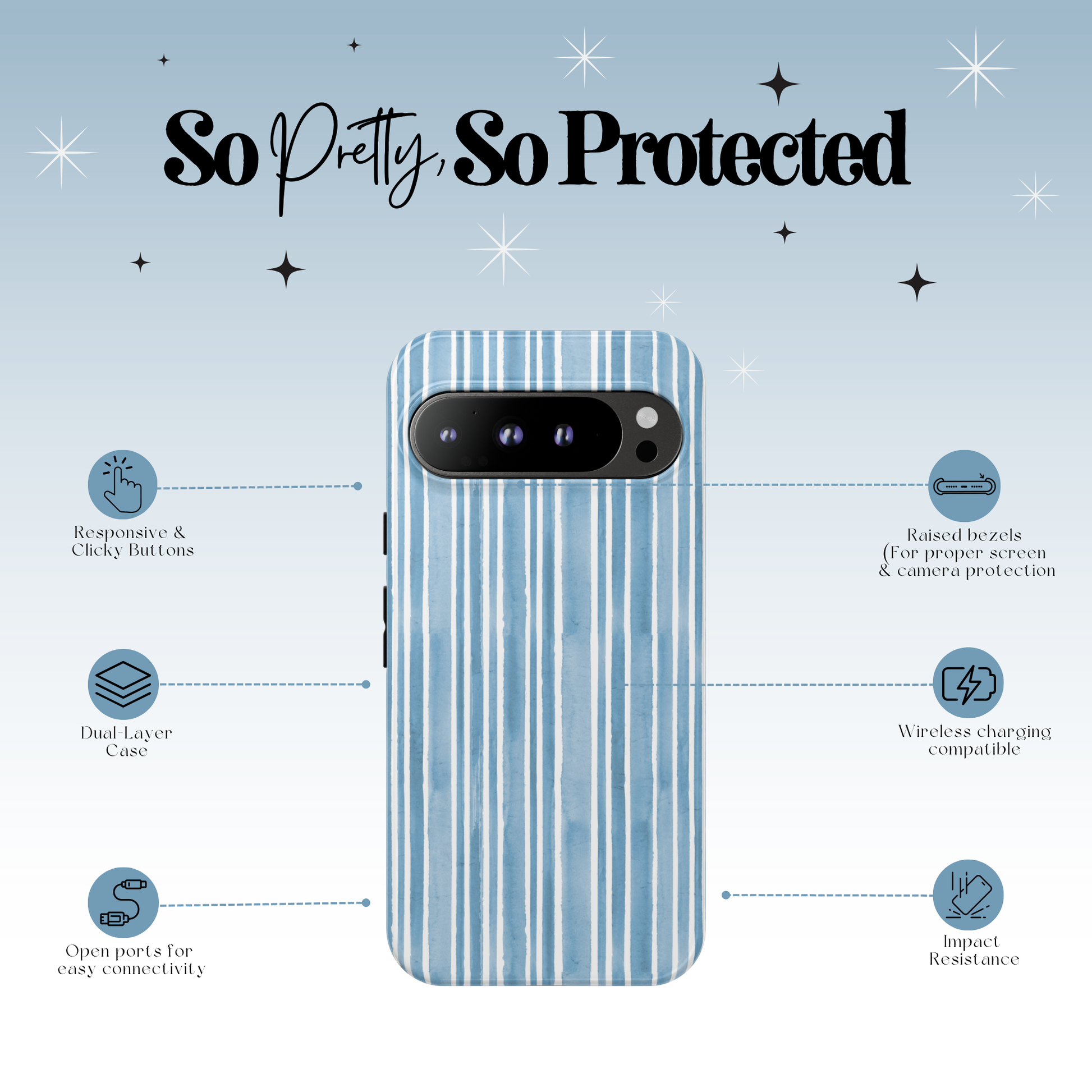Simple, timeless, and chic. This case features clean, crisp blue and white stripes that give a sophisticated, nautical feel with rugged protection.