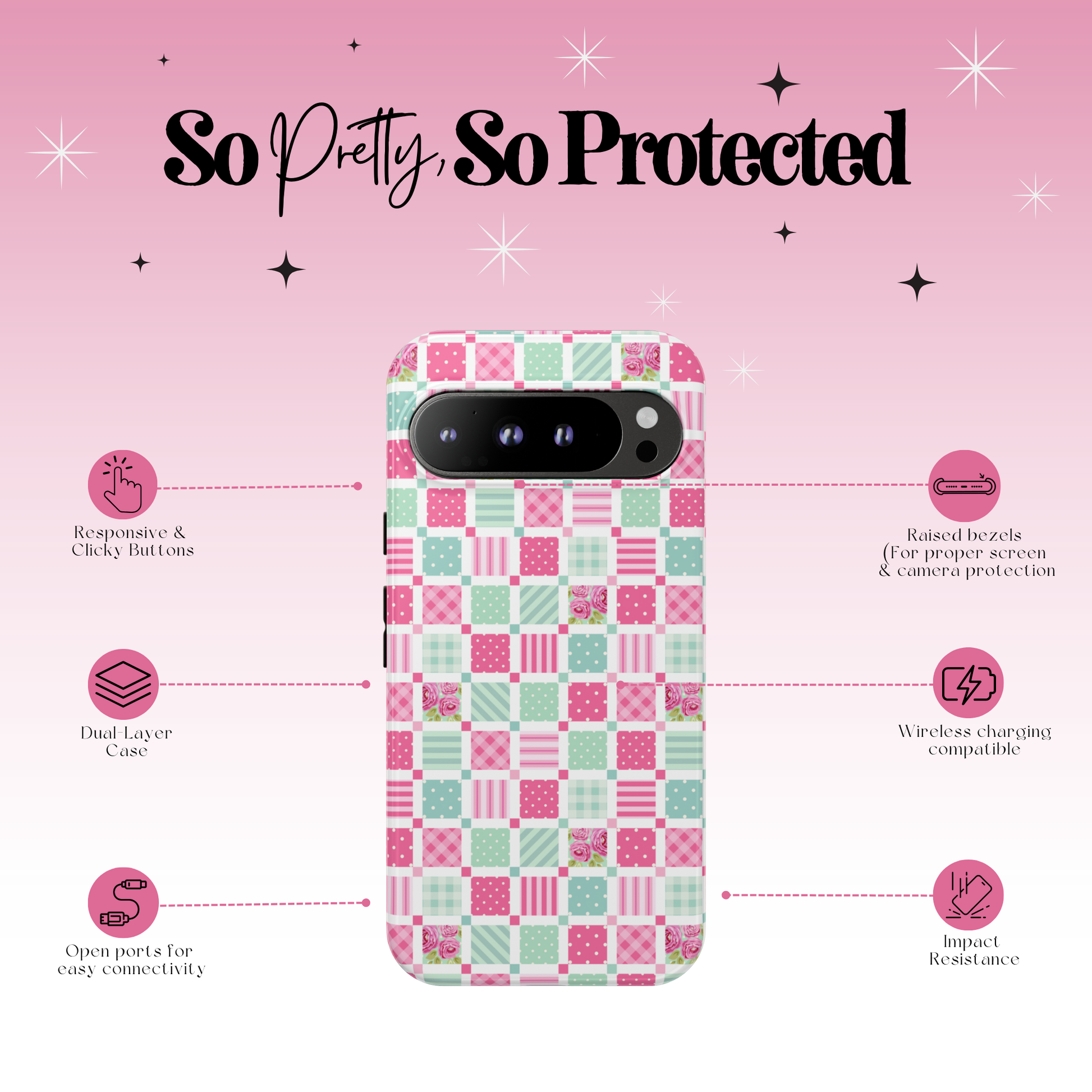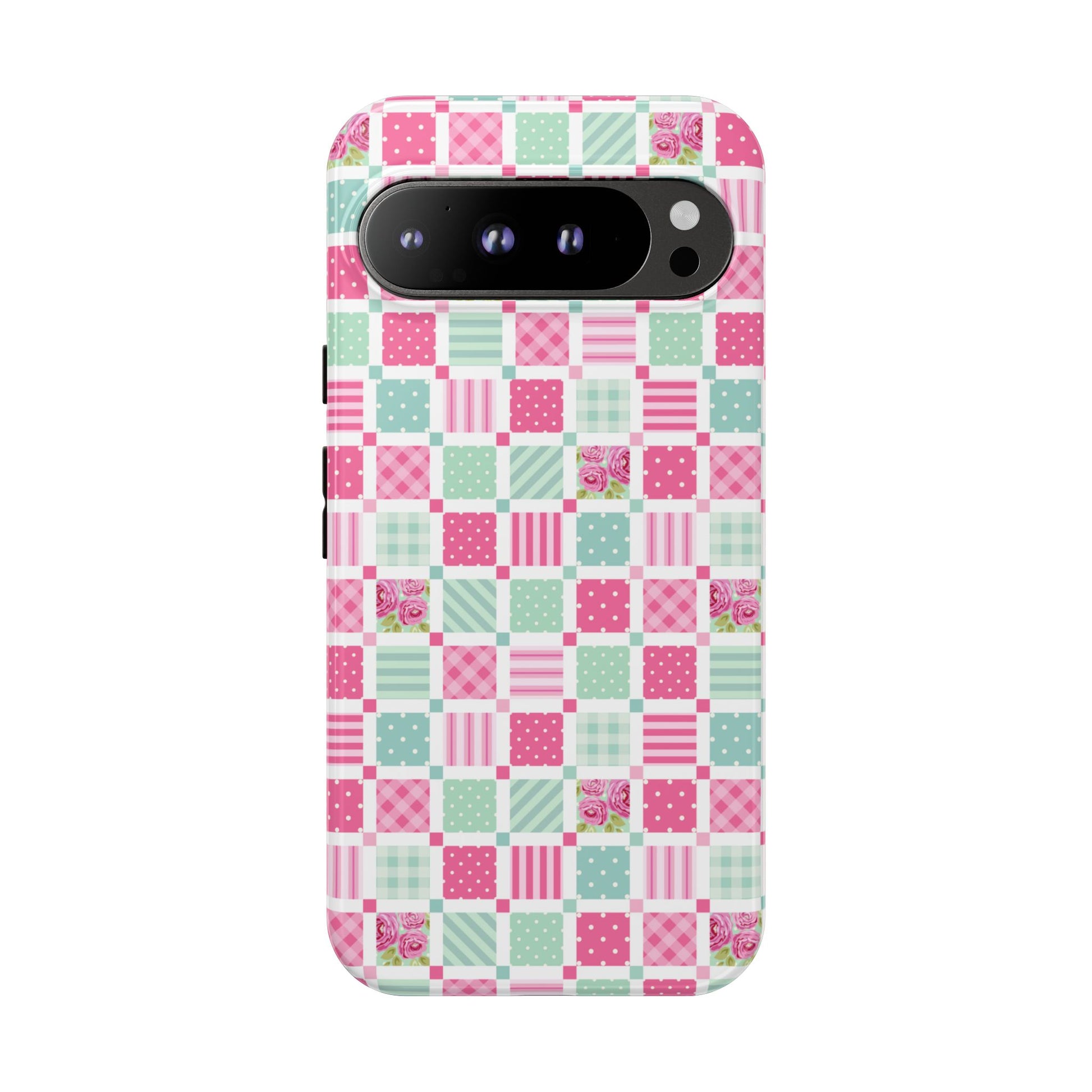 A charming blend of pink, mint, and white patches, featuring stripes, polka dots, and delicate roses. This delightful patchwork design brings a cozy, handcrafted feel to your phone, with tough, reliable protection