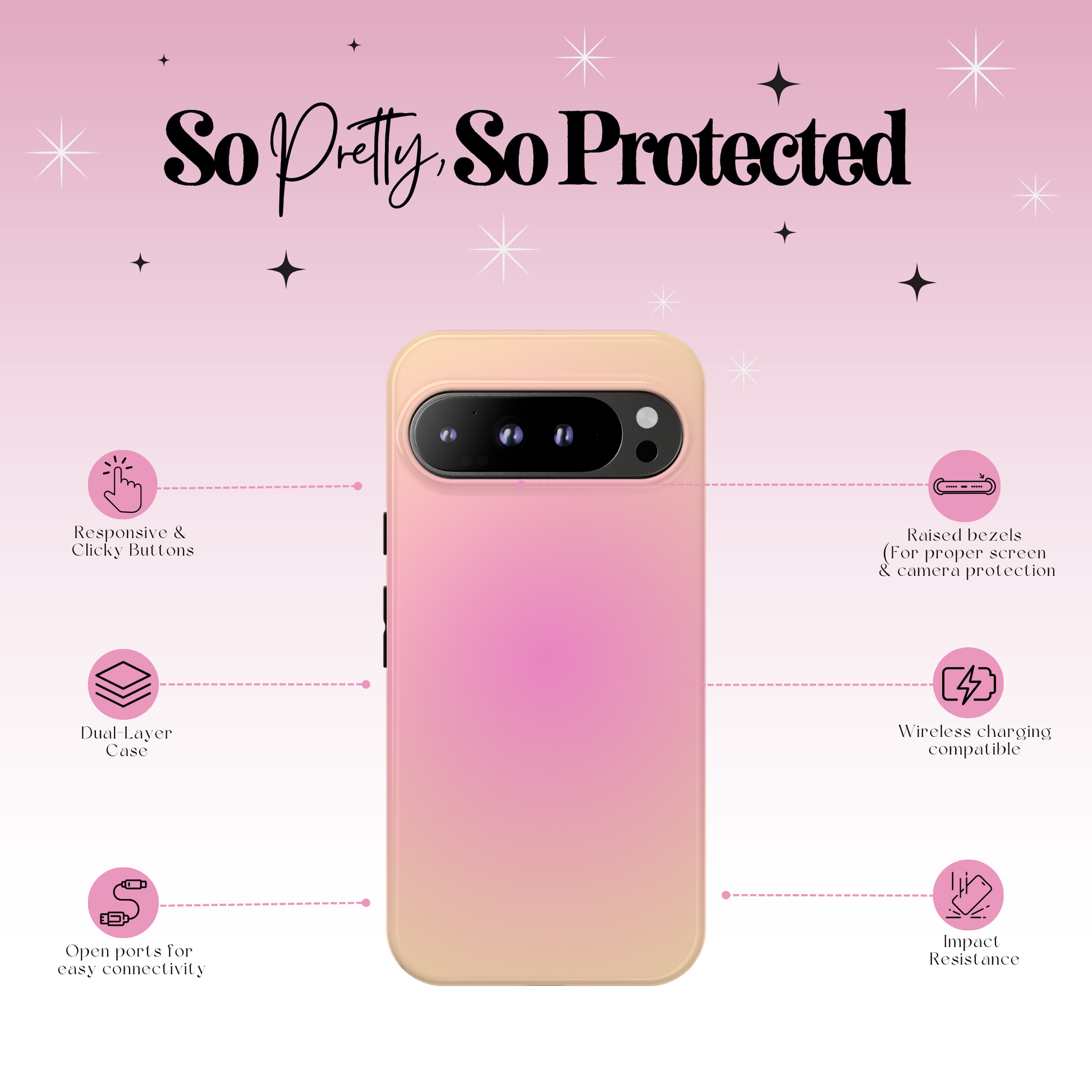 Indulge in the delightful blend of soft pink and warm, creamy peach. This sweet and cheerful gradient brings a joyful touch and resilient protection to your phone.